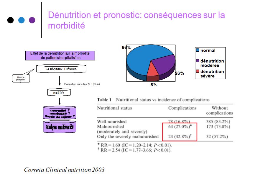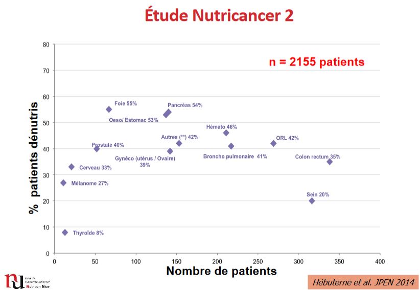 Deux études nationales (Nutricancer 1 et 2) ont été menées en France sur la question de la nutrition et du cancer. Dans les deux cas, en 2005 comme en 2012, sur un échantillon total de 2 155 patients, la dénutrition touchait en moyenne 39 % des patients soignés pour un cancer. Les patients les plus dénutris sont atteints de cancer du foie (55 % des cas), du pancréas (54 %) et de l’estomac (53 %). Principalement les cancers digestifs, donc.
