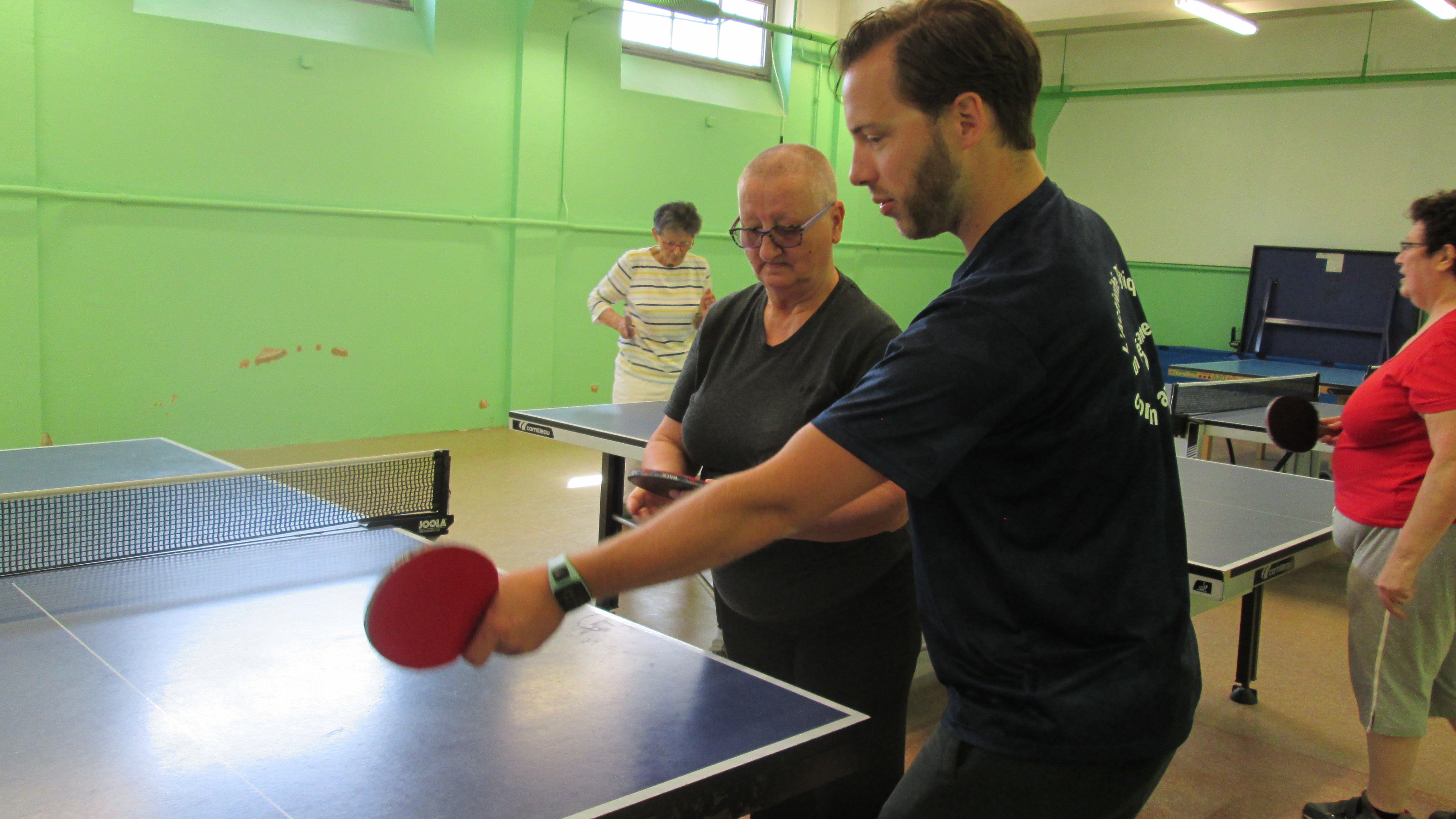“Je suis arrivée ici après de longues années sans rien faire à cause de la maladie. J’avais une leucémie. Depuis, je suis nettement plus vive. Ca m’aide dans le quotidien, c’est certain.” Odile en est persuadée, reprendre une activité physique lui a permis de rebondir après sa maladie qui l’a placée quatre mois dans un lit sans bouger ou presque. Il lui a fallu trois ans avant qu’elle ne se décide, sur les conseils de sa cancérologue, à redevenir active. “Elle me sentait capable alors aussitôt dit, aussitôt fait. Les cours venaient de commencer à Mortagne, alors j’en ai profité. Je trouve ça super”, glisse t-elle avec le sourire, tandis que sa partenaire de jeu attend l’engagement pour un nouvel échange de points en tennis de table. Sur les tables, des gobelets sont reversés de manière aléatoire. L’objectif est de tirer sur un maximum de gobelets pendant les échanges, plus vite que l’adversaire.